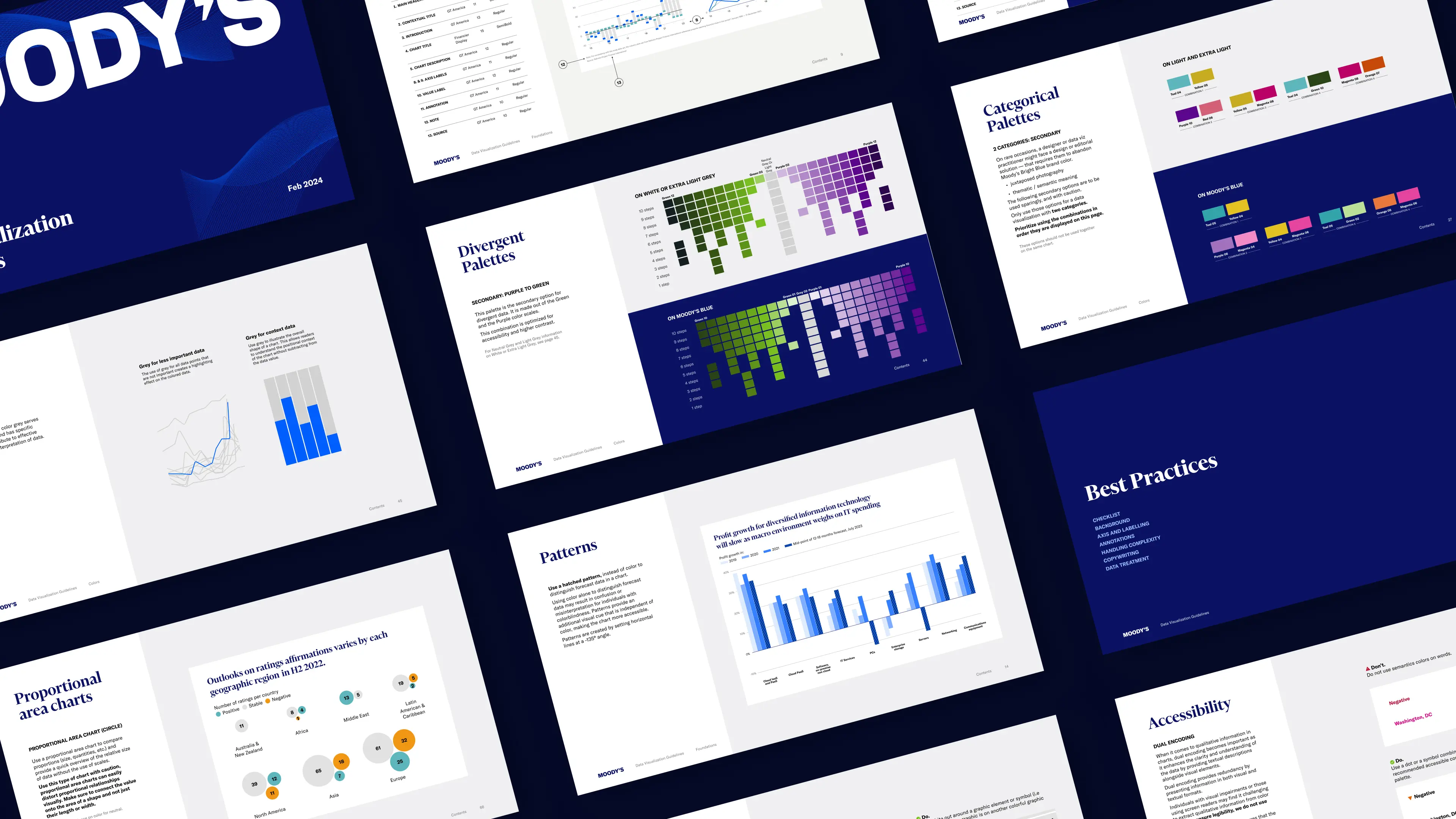This informed our development of a phased approach to implement new data visualization design guidelines. We translated Moody's core values—Clear, Bold, and Perceptive—into tangible design decisions, creating a visual language that spoke volumes, and conducted a rigorous color accessibility audit that set a new standard.